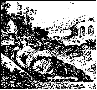 In a landscape of ruined buildings a woman lies in a fresh cut grave, a winged snake or serpent dragon coiling around her body, its mouth against hers.