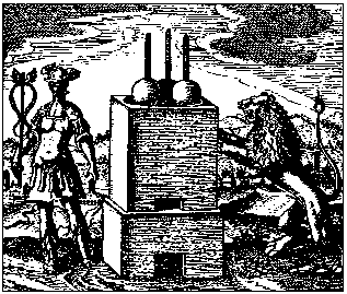 Hermes-Mercury stands on the left with his caduceus in his right hand, beside a large furnace, on top of which three long necked flasks are placed. On the right a Lion rampant stands beside the furnace.