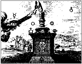 A hand of God (marked Mercury) emerges from a cloud on the left holding a candle taper, with which it lights (the flame being marked ) a candle standing upon a rectangular plinth (marked at bottom with Sulphur). At the bottom of the candlestick are the symbols ... The plinth has a panel with Sun, Moon, Saturn and Jupiter upon it. In the air to the right is the symbol of Antimony.