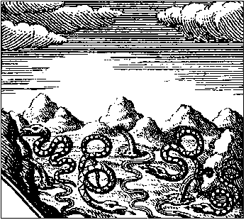 On a plain surrounded by mountains three springs flow from hills and form three streams. Four serpents move around the plain.