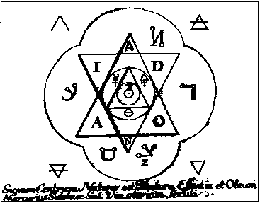The signs of the four elements are set in a square. Within this is a four lobed circular form, inside which is a hexagram or seal of Solomon. In the six triangular vertices is the six lettered name of God ADONAI, while around the hexagram are six letters in an angelic alphabet. At the centre of the hexagram is a circle with an inscribed triangle. Around the triangle are the symbols of Mercury, Sulphur and Salt, and inside it is a further circle , at the centre of which is a small circle surmounted with the letter 'T'. At the bottom is "The central sign of Nature is the essential tincture and oil. Mercury, Sulphur, Salt".