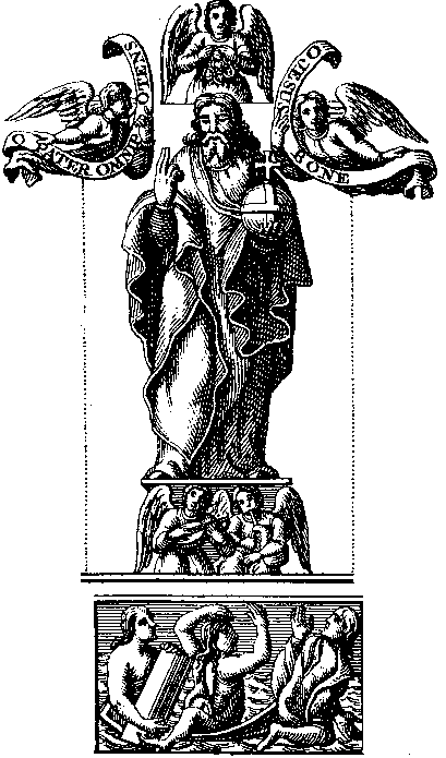 The philosophers do ordinarily use these terms of Art to hide the secret from evil men. They call the Body that black earth, obscure and dark, which we make white: They call the Soul the other half divided from the Body, which by the will of God, and power of nature, gives to the body by his inbibitions and fermentations a vegetable soul, that is to say, power and vertue to bud, encrease, multiply, and to become white, as a naked shining sword: They call the Spirit, the tincture & dryness, which as a Spirit hath power to pierce all Metallic things. I should be too tedious, if I should show thee how good reason they had to say always and in all places, Our Stone hath semblably to a man, a Body, Soul, and Spirit. I would only that thou note well, that as a man indued with a Body, Soul and Spirit, is notwithstanding but one, so likewise thou hast now but one only white confection, in the which nevertheless there are a Body, a Soul, and a Spirit, which are inseparably united. I could easily give very clear comparisons and expositions of this Body, Soul, and Spirit; but to explicate them, I must of necessity speak things which God reserves to reveal unto them that fear and love him, and consequently ought not to be written. I have then made to be painted here, a Body, a Soul, and a Spirit, all white, as if they were rising again, to show thee, that the Sun and Moon and Mercury are raised again in this operation, that is to say, are made Elements of air, and whitened: for we have heretofore called the blackness, Death; and so continuing the Metaphor, we may call Whiteness, Life; which commeth not, but with, and by a Resurrection. The Body, to show this more plainly, I have made to be painted lifting up the stone of his tomb, wherein it was inclosed: The Soul, because it cannot be put into the earth, it comes not out of a tomb, but only I have made it be painted amongst the tombs, seeking its body, in form of a woman, having her hair dischevelled; The Spirit which likewise cannot be put in a grave, I have made to be painted in fashion of a man coming out of the earth, not from a Tomb. They are all white; so the blackness, that is death, is vanquished, and they being whitened, are from henceforward incorruptible. Now lift up thine eyes on high, and see our King coming, crowned and raised again, which hath overcome Death, the darknesses, and moistures; behold him in the form wherein our Saviour shall come, who shall eternally unite unto him all pure and clean souls, and will drive away all impurity and uncleanness, as being unworthy to be united to his divine Bidy. So by comparison (but first asking leave of the Catholic, Apostolic, and Roman Church, to speak in this manner, and praying every debonaire soul to permit me to use this similitude) see here our white Exilir, which from henceforward will inseparably unite unto himself every pure metallic nature, changing it into his own most fine silvery nature, rejecting all that is impure, strange, and Heterogeneal, or of another kind. Blessed be God, which of his goodness gives us grace to be able to consider this sparkling white, more perfect and shining than any compound nature, and more noble next after the immortal soul, than any substance having life, or not having life; for it is a quintessence, a most pure silver, that hath passed the Coppell, and is seven times refined, saith the royal Prophet David. It is not needful to inperpret what the two Angels signify, that play on Instruments over the heads of them which are raised again: These are rather divine spirits, singing the mervails of God in this miraculous operation, than Angels that call to judgement. To make an express difference between these and them, I have given the one of them a Lute, the other a haultboy, but none of them trumpets, which yet are wont to be given to them that are to call us to Judgement. The like may be said of the three Angels, which are over the head of our Saviour, whereof the one crowneth him, and the other two assisting, say in their Rowles, O PATER OMNIPOTENS, O JESU BONE, that is, O Almighty Father, O good Jesu, in rendering unto him eternal thanks.