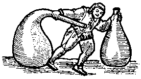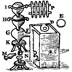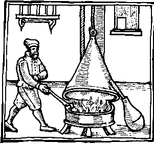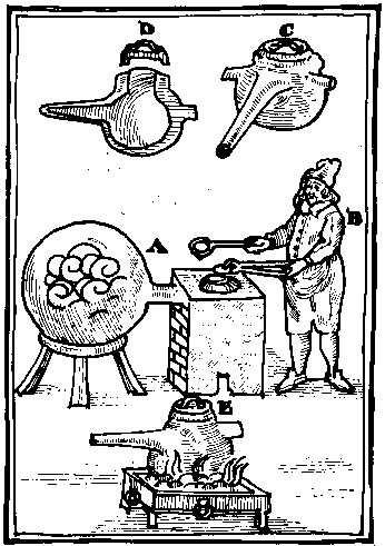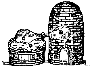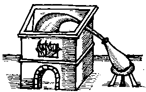 The furnace is made as follows. It may be made of one piece by a potter or of brick, round or four-square, greater or lesser as you please. If the inside be one span broad in the middle, it must be high, one for the ash hole, another above the grate to the middle coal hole and two above the pipe. This pipe, being made of earth or iron, must be a span long between the furnace and the receiver, and a third part as wide as the furnace within.