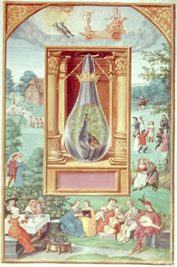 To trace the connection of copper with Venus we have to go back to a distant mythological era: back, in fact, to a Mediterranean isle, once ruled by a love-goddess - the island of Cyprus. This island was regarded as the domain of Venus-Aphrodite. Aphrodite was referred to as the 'Cyprian goddess'. In Botticelli's picture, The Birth of Venus, she is depicted as being born from the sea on to the shores of Cyprus. It is from the name of this island, Cyprus, that the word copper derives. The word copper comes from the Latin word cuprum and this derives from the Greek work Kyprus. Cyprus was in antiquity the principal source of copper, and so the metal was named after it. Venus was felt by antiquity to dwell just where such large amounts of copper had condensed. Venus was credited with a sea origin, and copper reminds us of this connection with the water element. All copper salts are sea-coloured, blue or green. All the ores and all the salts of copper are hydrated, water containing. Nearly all copper salts are highly soluble in water. The iridescent hues of a peacocks tail (see picture) derive from green-blue copper complexes.