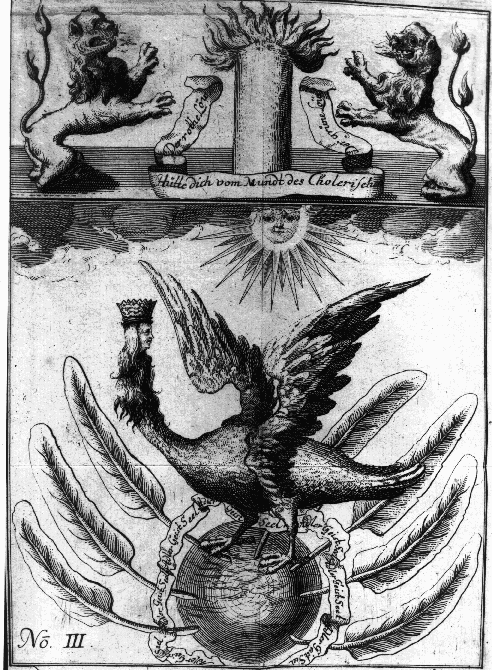 The Ripley ScrollThe Ripley Scroll is an important 15th century work of emblematic symbolism. Twenty one copies are known, dating from the early 16th century to the mid-17th. There are two different forms of the symbolism, with 17 manuscripts of the main version, and 4 manuscripts of the variant form. There are very wide variations in the English text on the different manuscripts, and for the text here I have modernised and unified a number of versions. This is not a properly researched edition, but a reworking of the text into a modern readable form. I add the engravings of the Scroll printed in David Beuther, Universal und Particularia... Hamburg, 1718.You must make Water of the Earth, and Earth of the Air, and Air of the Fire, and Fire of the Earth. The Black Sea. The Black Luna. The Black Sol. ![]() Here is the last of the White Stone and the begining of the Red. Of the son take the light The Red gum that is so bright And of the Moon do also The which gum they both trowe The philosophers Sulphur vive This I call it without strife Kybright and Kebright it is called also And other names many more Of them drawe out a tincture And make of them a marriage pure Between the husband and the wife Espowsed with the water of life But of this water thou must beware Or else thy work will be full bare He must be made of his own kind Mark thou now in thy mind Acetome of philosophers men call this A water abiding so it is The maidens milk of the dew That all the work doth renew The Serpent of life it is called also And other names many more The which causeth generation Betwixt the man and the woman But looke thou no division Be there in the conjunction Of the moon and of sun After the marriage be begun And all the while they be a wedding Give to them their drinking Acetome that is good and fine Better to them then any wine Now when this marriage is done Philosophers call it a stone The which hath a great nature To bring a stone that is so pure So he have kindly nourishment Perfect heat and decoction But in the matrix when they be put Let never the glasse be unshut Till they have ingendred a stone In the world there not such a one ![]() The Red Lune. The Spirit of Water. Red Sol. The Red Sea. On the ground there is a hill Also a serpent within a well His tail is long with wings wide All ready to flee by every side Repair the well fast about That thy serpent pass not out For if that he be there a gone Thou lose the virtue of the stone Where is the ground you must know here And the well that is so clear And what is the dragon with the tail Or else the work shall little avail The well must run in water clear Take good heed for this your fire The fire with water bright shall be burnt And water with fire washed shall be The earth on fire shall be put And water with air shall be knit Thus ye shall go to purification And bring the serpent to redemption First he shall be black as a crow And down in his den shall lie full low Swelling as a toad that lieth on the ground Burst with bladders sitting so round They shall to burst and lie full plain And this with craft the serpent is slain He shall shine colors here many a one And turn as white as whale's bone With the water that he was in Wash him clear from his sin And let him drink a little and a light And that shall make him fair and white The which whiteness be abiding Lo here is a very full finishing Of the white stone and the red Lo here is the very true deed. The Red Lion. The Green Lion. The Mouth of Choleric beware.