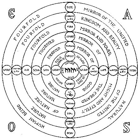 There is also among 7 stars, hardly one turning its rays inward to direct the searching mind to Bethlehem, and amongst 7 eyes winding around the whirlpool of searching desire is hardly one which stands towards the Sabbath in the innermost; but the restless movement of the working days move them through all spheres, and even if they take a look at God's wonders, they only look upon the surface and every eye looks upon that which is shown through its own desire. God made man to live in an eternal Sabbath, he should not work, but let God work in him, he should not take with his own hands, but only receive what God bestowed plentifully upon His mercy. But man left the Sabbath, and wanted to work himself, raised his hand against the law to take in his own desire what he should not have taken. Therefore, God let him fall, and since he had despised the quiet, he had to feel painfully the restlessness. In such restlessness of life all children of man still extend their hands, trying to grasp their pleasures. And as is their understanding and will, so is their grasping. Some grasp for the good, some grasp for the evil. Some grasp for the fruit, some only for the leaves, some for a branch with fruits and leaves on it. And they derive pleasure from the things they have grasped, these poor fools do not know that all their pain and labor had only been a Studium particulare. They grasp for pieces, where they could obtain the whole. They seek for quiet and cannot find it; for they look from the outside into the restlessness of movement, which dwells in the inner solitude of the inner Centri, and though one may grasp more than the other, it is still piece-work. At times there may be one amongst 7 hands coming near the secret and it grasps the whole stem of the tree at that point where all the divided branches return to unity. But even this hand is still far from the roots of the tree, only grasping and holding the secret from the outside and cannot yet see it from the inside. For the root of this tree is understood only by the eye of wisdom, standing in the Centro of all spheres. These roots go from the visible world of mingled good and evil, into the sphere of the invisible world. This eye looks with the greatest peace upon the wonders of all movements and also looks through all the other eyes, wandering about outside of the rest in the unrest, all those eyes which want to see for themselves without the right eye of wisdom, from which they have received all their seeing-power. This eye can prove all spirits, how intelligent, pure and acute they be. It understands the sources of good and evil. Plain before it is light and darkness. It understands time and eternity, visible and invisible, present and future things, earthly and heavenly things, things of the body and things of the spirit, high and deep, outwardliness and inwardliness. And nevertheless, none of these things are disturbed by it, for the eye lives in the Centro of peace, where everything stands in equality outside of any strife, and whatever it sees it possesses. For in the Centro of its peace is its kingly throne, everything being subject to it. Therefore, dear man! If thou wouldst return to right understanding and right peace, cease from thy works and let God alone work in thee, so that the eye of wisdom will open in thine own self and thou wilt attain a studio particulari ad universale and One find All.