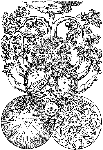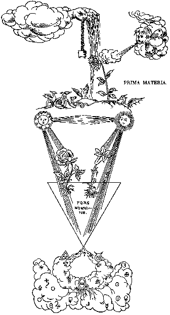 The Prima Materia derives its existence from the Fiat, the Word of creation. And this Word comes from the Father who is the creator of all things, and the Spirit radiates from both: This is God's life giving air. Then, too, air brings to Iife everything within the elements. The fire warms all things, the water refreshes, delights and saturates all things: And the nitrous earth, Mother-like, nourishes and sustains all things; the air was born out of fire, and in turn makes the fire burn, that it may live, but air in the form of water is food for the fire, and the fire burns into this element: Water and dew of the ground, the greasy fat dew of the ground, the earth as keeper of nitrous salt nourishes it. For the womb of the earth is the sulphuric nitrous salt of nature, the one good thing God has created in this visible world.