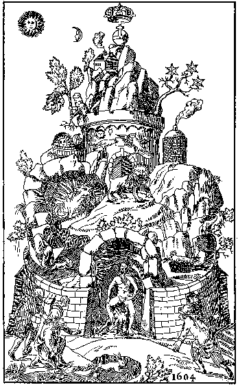 The soul of men everywhere was lost through a fall, and the health of the body suffered through a fall, Salvation came to the human soul through Iehova, Jesus Christ. The bodily health is brought back through a thing not good to look at. It is hidden in this painting, the highest treasure in this world, in which is the highest medicine and the greatest parts of the riches of nature, given to us by the Lord Iehova. It is called Pator Metallorum, well known to the philosopher sitting in front of the mountain-cave, easy to obtain for anybody. But the sophists in their sophistic garb, tapping on the walls, recognise him not. At the right is to be seen Lepus, representing the art of chemistry, marvellously white, the secrets of which with fire's heat are being explored. To the left one can see freely what the right Clavis artis is; one cannot be too subtle with it, like a hen hatching a chicken. In the midst of the mountain, before the door stands a courageous Lion in all its pride, whose noble blood the monster-dragon is going to shed; throwing him into a deep grave, out of it comes forth a black raven, then called Ianua artis, out of that comes Aquila alba. Even the crystal refined in the furnace will quickly show you on inspection Servum fugitivum, a wonder-child to many artists. The one effecting this all is Principium laboris. On the right hand in the barrel are Sol and Luna, the intelligence of the firmament. The Senior plants in it Rad. Rubeam and albam. Now you proceed with constancy and Arbor artis appears to you, with its blossoms it announces now Lapidem Philosophorum. Over all, the crown of the glory, ruling over all treasures.