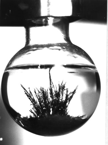 This experiment involves no special subtle transmutation, but the chemically respectable process of the precipitation of metallic silver from a solution of silver nitrate by the chemically more electropositive metallic mercury. For the first experiment (A) a 10% solution was used - 10 grams silver nitrate made up to 100 ml solution in water. About 20 grams of metallic mercury was introduced into the solution at normal room temperature in a 100 ml round bottomed flask, in small quantities at a time. As the mercury entered the transparent solution a brown precipitate immediately formed as a kind of veil in the solution, but within a few minutes this disappeared. One observed within the space of 15 minutes, small growths forming on the surface of the bubble of mercury, and within a hour a kind of grey mossy precipitate had formed around the mercury which had been completely transformed. As the experiment had reached a stasis and equilibrium, more mercury was introduced and within a further 12 hour small tree like growths began to press up out of the mossy precipitate at the bottom of the flask. These forms were very delicate and the slightest vibration disintegrated them. After a third addition of mercury, more rigid crystals of silver began to form within a further hour or so. These rigid crystals began to act as the trunks for the trees of silver which precipitated in the form of ramifying branches and fine leafy structures. These were much more stable and indeed the forms survived some few weeks.