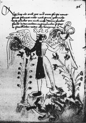 There is one definite source for some of the Rosarium images, the Buch der heiligen Dreifaltigkeit manuscript of around 1410. This has three images from the Rosarium and predates it by 140 years. The second, less certain source, is another German work, the Hartung vom Hoff manuscript dated just one year before the appearance of the Rosarium.