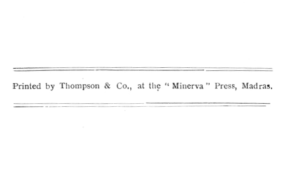 Printed by Thompson & Co., at the "Minerva" Press, Madras.