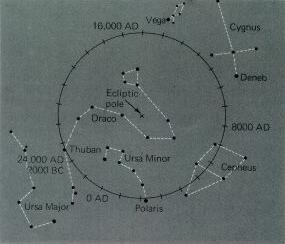 The first difference is 2000 years ago the celestial north pole was not where the star Polaris is. Today the celestial north pole is very close to Polaris. We call Polaris the North Star because if you can find it and point to it you will be pointing North. However, around 0 A.D. the celestial north pole was actually between the Big Dipper and Little Dipper, as shown on this diagram at left. (Note: There actually is no year 0 A.D., the years jump from 1 B.C. to A.D. 1.)