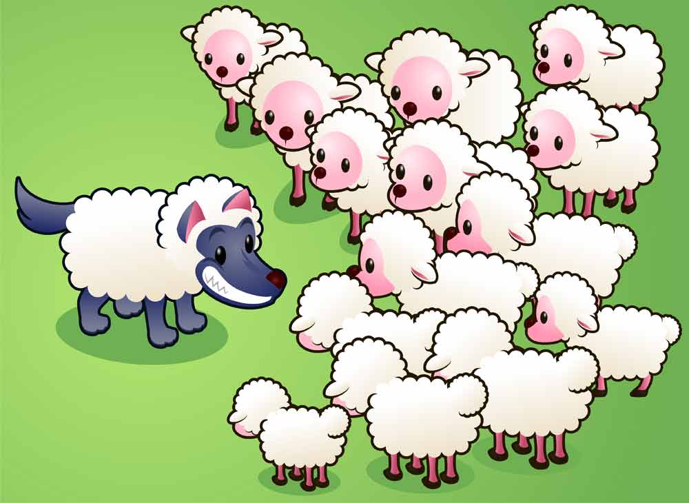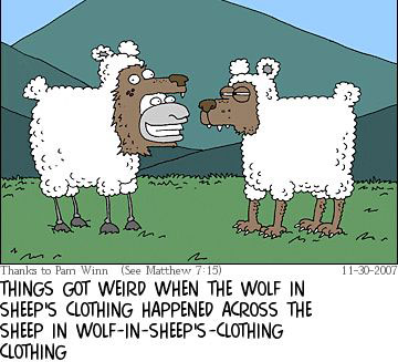 "Beware of false prophets, who come to you in sheep's clothing but inwardly are ravenous wolves. You will know them by their fruits. Are grapes gathered from thorns, or figs from thistles? So, every sound tree bears good fruit, but the bad tree bears evil fruit." (Matthew 7:15) "Behold, I send you out as sheep in the midst of wolves; so be wise as serpents and innocent as doves. Beware of men; for they will deliver you up to councils, and flog you in their synagogues, and you will be dragged before governors and kings for My sake ..." (Matthew 10:16) |