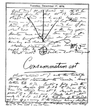 December 14. H.S.O. gone off early. Wimb. and Judge trying to help H.P.B. Today the trunks must go.—They do go—care of Hur. Chund, Bombay. So much the less. Tales feeling a sudden love for H.P.B. sends carriage and boy after her. Positive refusal.—Miss Potter came and wants to join Theosophical. Promises to send $5. Vediamo. Marble comes and—H.P.B. falls asleep.