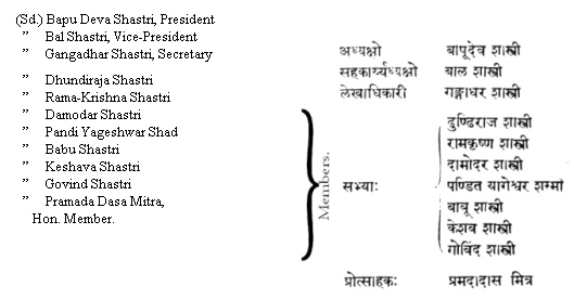 given practical proofs of our alleged affection for India. Our final vindication must be left to posterity, which always renders that justice that the present too often denies. But even now—if we may judge by the tone of our correspondence, as well as by the enthusiasm which has everywhere greeted us in the course of our journeyings—a palpably good effect has been produced by our appeals to the educated Indian public. The moral regeneration of India and the revival of her ancient spiritual glories must exclusively be the work of her own sons. All we can do is to apply the match to the train, to fan the smouldering embers into a genial warmth. And this we are trying to do. One step in the right direction, it will doubtless be conceded, is the alliance effected with the Benares pandits and attested in the subjoined document:––