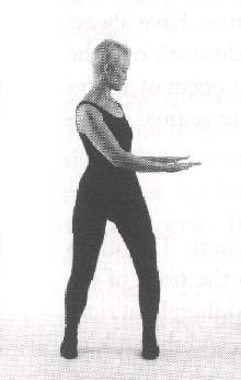 The hands are pulled upward to the level of the shoulders, the palms facing forward, in a straight line with the forearms. A deep inhalation is taken. The hands are held in this position as the trunk turns to the left. The hands then strike, with the palms down, to the level of the hips (fig. 104). The air is exhaled sharply. The hands are raised above the shoulders again as the trunk turns to the front, and a deep inhalation is taken. With the hands still above the shoulders, the trunk is turned to the right. Next both hands strike, with the palms down, to the level of the hips as the air is exhaled.