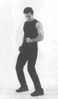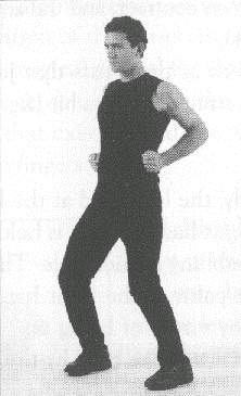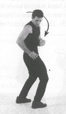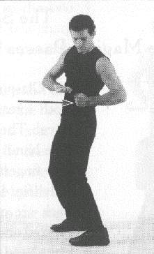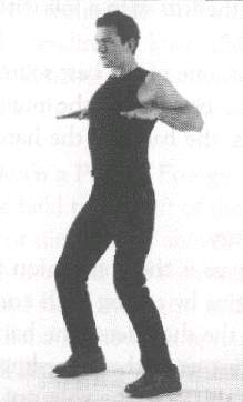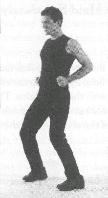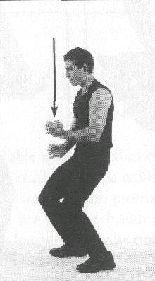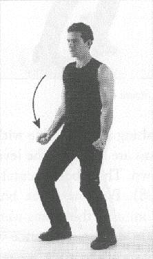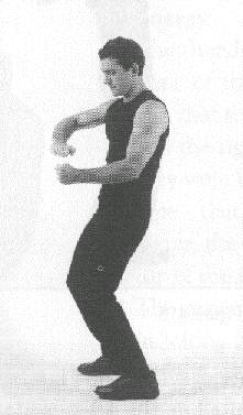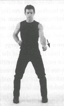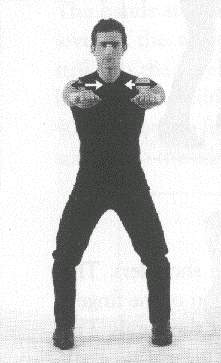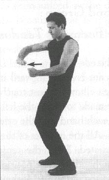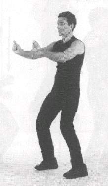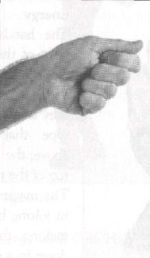 Both 'arms are raised to the front, at the level of the shoulders. The hands are held in angular fists, meaning that the position of the fingers slants down heavily as they are held against the palm of the hands. The thumbs are held on top of the outer edge of the index fingers (fig. 410). The palms of the hands face each other. A sharp jolt of the wrists makes the fists go down slightly, but with great force. The level of the wrists never changes; in other words, only the hand pivots down on the wrists.