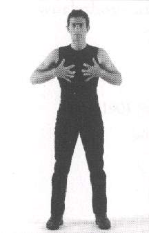 The hand positions for both of these magical passes are shown here with the practitioner standing. The actual practice of these magical passes is performed lying flat on the back with the leather weight pressing right above the navel or on either of the other two choice spots on the abdomen: below the navel, or above it by the solar plexus, if placing the weight on them is more comfortable.