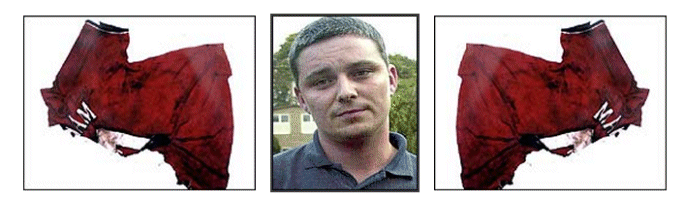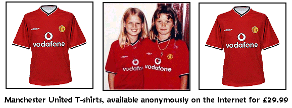 time. In order to try and “cover” this critical deficiency the prosecution then claimed that traces of chalk and concrete particles used as a surface on the track [at Lakenheath] had been found on the bottom of Huntley's car, and pollen grains found inside the vehicle that matched the area. It was a nice try, but pointless and grossly misleading. Because the total lack of human DNA from either girl proved they had never been transported in Huntley’s red Fiesta, then where or when the car was driven, and what might or might not be stuck to the underside of the vehicle, is completely irrelevant. The biggest “smoke and mirrors” prosecution conjuring trick of week one, was unquestionably that of the bright-red Manchester United T-shirts worn by the two girls the day they vanished. Nowadays if you key “Holly Jessica” into the Google image engine, most of the front page fills up with photographs of the girls wearing these famous T-shirts, and there is a natural tendency to believe Holly and Jessica’s shirts are unique. Nothing could be further from the truth. Tens of thousands of Manchester United T-shirts have been produced by the same mill from identical red fibres, to the point where they can be purchased by anyone with minimum effort. Identical T-shirts are available anonymously on the Internet for £29.99 |
