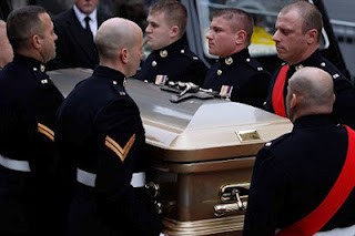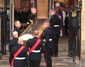 Savile had links to top people. Pall bearers from the Royal Marines carry the coffin of Sir Jimmy. Website for this image