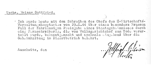 Auschwitz Document"revealing a state secret ... sentenced to death"In this undated document (certainly from June or July of 1944), SS-Unterscharführer (Sergeant) Gottfried Weisse states that he has been informed about the conviction and execution of a woman for revealing state secrets, and that he has been formally reminded of the camp's strict secrecy policy. The camp's name: Auschwitz. Transcription: