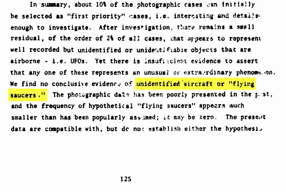 With that question looming at least in my mind, I aimed to find out. First, I will bring up the fact that within The Black Vault for quite some time, I have had an original copy of what is known as the “Condon Report.”  If you know what that is; don’t assume where I am about to go with this. For those who aren’t aware, this document contained the findings of a committee formed at the University of Colorado in 1966, which lasted through 1968, that analyzed hundreds of UFO files from the Air Force’s Project Blue Book. Their determination was expected. They said there was nothing to the UFO phenomenon; they posed no national security threat; and they recommended no further study of them.  Why am I bringing this report up, when we are all supposed to be keeping an optimistic outlook on these new “UFO Regulations” by the Navy?  Well, because simply  it connects the phrase “unidentified aircraft” directly with “flying saucers.”  Page 125 of the Condon Report stated: