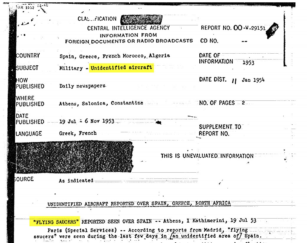 Despite the terms “flying saucer” and “unidentified flying object” or the acronym “UFO” appearing frequently throughout most official documents regarding Project Blue Book; “unidentified aircraft” not so much. So, the above excerpt connected the two-word phrase “unidentified aircraft” directly to the UFO phenomenon, on an official level. Granted, the “Condon Report” and news today about reporting procedures are separated by about 51 years; but the phrasing and use of “unidentified aircraft” is clearly a bit less mysterious (or newsworthy), which may explain why that is used to convey the same thing, without actually saying it. For those who might think this link is a coincidence, files I received by the Central Intelligence Agency (CIA) on UFOs many years ago, also connect the phrase. That connection goes back even farther from the Condon Report.  For example, this 1953 CIA intelligence document, which outlined UFOs in Spain, Greece and North Africa. The CIA’s choice of phrasing for the “subject” line, despite the report itself referencing “flying saucers?”  They chose “unidentified aircraft.”