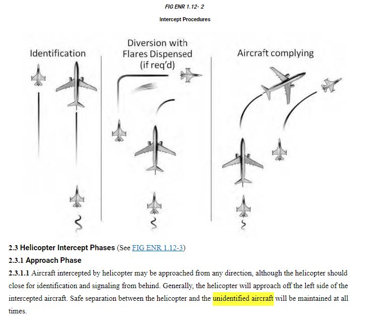 In the Federal Aviation Regulations (FAR) or the Aeronautical Information Manual for 2019, which is available direct from FAA.GOV, Chapter 5 outlines specific procedures for intercepting an “unidentified aircraft” — complete with a diagram. The diagram uses the outline of a commercial airliner as the “unidentified aircraft” but of course, the intercept procedures would be applicable to any “unidentified craft” regardless of its shape, size or origin.