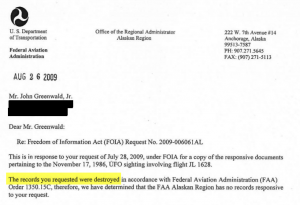 Fast forward more than 17 years after my initial request.  I believe I found the records.  I discovered them in Record Group 237: Records of the Federal Aviation Administration, 1922 – 2008. Holding National Archives Identifier number 733667, and local identifier number 1203, I found more than 1,500 pages regarding the JAL1628 UFO encounter. I believe, but this is only a guess as of the writing of this article, that the FAA must have transferred a copy to the National Archives, but either did not keep a record of the transfer (which they should have) or they attempted to mislead me that the records had been destroyed, when in fact, they were not. Plus, this is more than 1,400 pages than the FAA’s original estimate, and more than 1,200 pages archived by NICAP’s original JAL1628 files.