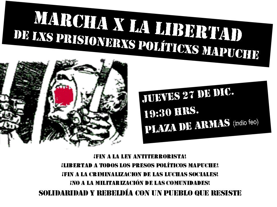 Marcha por la Libertad de los Presos Políticos MapuchesJueves 27 de Diciembre19:30 hrsPlaza de Armas (Compañía esquina Ahumada)¡Fin a la ley antiterrorista!¡Libertad a todos los presos políticos mapuche!¡Fin a la criminalizacion de las luchas sociales!¡la lucha de liberación nacional mapuche no es terrorismo!¡No a la militarización de las comunidades!¡no al nuevo aeropuerto en quepe!¡no a la minera en el lago lleu lleu!¡fuera las bases de carabineros y de la armada del lago lleu lleu!¡fuera las forestales, mineras e hidroeléctricas de los territorios ancestrales indígenas!¡tierra, autonomía y socialismo para los pueblos originarios de chile y el mundo!porque los pueblos originarios que viven en chile, la clase trabajadora chilena y los trabajadores inmigrantes tenemos un mismo enemigo: el capitalismo...¡a luchar por un estado multinacional y socialista, con igualdad efectiva de derechos para todos los pueblos que viven en él, incluido el derecho a la autodeterminación e independencia!Solidaridad y rebeldía con un pueblo que resistePor el poder Obrero, popular y originario...socialismo multinacionalpartido revolucionario marxista-leninista de chileprml de chile