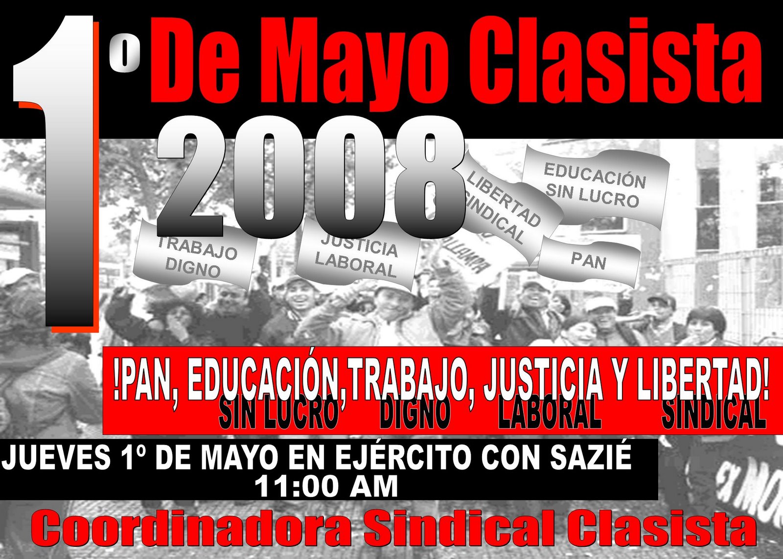 La COORDINADORA SINDICAL CLASISTA invita a todos los Trabajadores y Trabajadoras de todos los Pueblos que viven en Chile (Pueblo Chileno, Pueblos Originarios y Pueblo Trabajador Migrante) así como a sus familias a un Gran Acto Clasista este Primero de Mayo en Ejército con Sazié a las 11:OO AM en donde conmemoraremos unitaria y combativamente el Día Internacional del Proletariado.