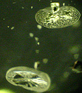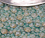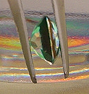 What are they? The leftmost picture is a magnification of a type of inclusion characteristic of peridot gemstones, particularly those from Arizona, they are called lily pads, although I must admit "flying saucers"comes to my mind. This picture is described and discussed in Lesson 5: "Magnification and What it Reveals". Secondly, we see part of the magnified surface of a rough diamond, the triangular markings, known as "trigons" are diagnostic to diamond. This image finds use in Lesson 5 and also in Lesson 8: "Synthetics and Simulants". Next we see a 10x magnified picture of the lid of a 1920's Art Deco cosmetic jar. It is covered with shagreen, which is a leather made from sharkskin -- an unusual, but valuable. organic material sometimes used in jewelry and ornamental items. You'll learn more about shagreen in the essay on Unusual Organics. Finally, you are seeing a view of a type of simulated emerald widely sold under the trade name "Soude" or sometimes "spinel triplet". It consists of two colorless layers of glass or white spinel with green glass or even green glue in between. In Lesson 8 we will see a view of this gem as it would appear in jewelry (perfectly uniformly green), and, as in this photo, immersed in water and photographed from the side revealing its "sandwich like"nature.