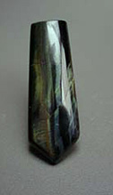 The most well known and available gem with this effect is tiger'seye and its bluish relative hawk'seye. Until just recently, tiger's eye was thought to be a "pseudomorph" meaning a mineral in which crystals of one material take on the form of another. Tiger'seye, in virtually all current gem books is called a chalcedony pseuodomorph of crocidolite (a form of asbestos).