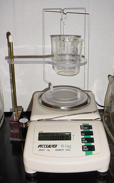 Hydrostatic weighing compares the weight of the gem in water to the weight of the gem in air with a specially rigged balance. Using these two values and a formula based on Archimedes' Principle one can calculate the SG very accurately. Although more expensive and time consuming to use than heavy liquids, there are no hazards associated with the technique and gems are not damaged as a result.