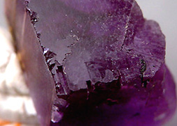 Both amethyst and chalcedony are the same species: namely quartz, so their crystals (whatever their size) are of the trigonal system, and their chemical formula is SiO2, but the difference in the crystal sizes and arrangement creates some notably different physical and optical properties in the two varieties. For example, amethyst, and other single crystal quartzes, are commonly transparent and one color, while chalcedonies, agates, and other aggregate quartzes are translucent to opaque and often have complex color patterns. Although single crystal and aggregate types of quartz are equally hard, the aggregates are notably tougher. Recall this pair of photos from Lesson 2 which also serve as good examples here: