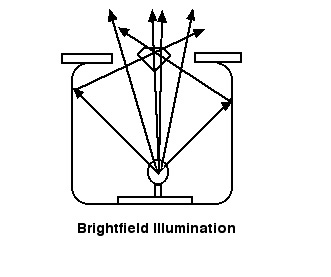With brightfield lighting the light entering the gem comes from below as well as from the side. The amount of light entering the viewing area is manually controlled by an iris diaphragm, and frequently diffused with a special frosted glass coverplate. This type of lighting is ideal for seeing color zoning, dye concentrations, and the curved growth bands indicative of certain types of synthetic gems.