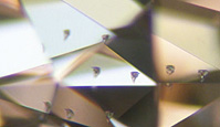 [An unpolished area of a diamond girdle (a "natural") showing "trigons": triangular growth marks that prove diamond identity: image courtesy of Joe Mirsky, the "engine-turned" effect proving natural, specifically elephantine, ivory, a surface reaching fracture in a sapphire which substantially lowers its clarity grade: image courtesy of Martin Fuller] Inclusions and other internal features: Internal clarity characteristics of a gemstone are represented by four major groups: solids, cavities, cracks and growth phenomena.