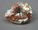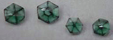 A notable exception to the way in which gems are clarity graded would be in the case of those gems whose visible inclusions create its value, rarity, or beauty. In that case, only the surrounding gem material is clarity graded. In the photos below, we see two such cases: the "trapiche" emeralds with their black "cog-wheel" inclusions are rare collectors items, and so the clarity grading would be done in regards to the green areas only, the "confetti" sunstone is desirable primarily due to its glittery hematite particles which flash gold, red and blue, so the clarity grade speaks to only other, extraneous, inclusions that might be present.