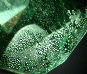 [Oil-filled fractures in emerald, image courtesy of Martin Fuller] 4) Growth Phenomena: This "catch-all" category includes visible evidence of twinning, and other features of the gem's growth . Examples include "swirl marks" which occur in amorphous materials, primarily glasses, and either curved or straight growth or color zoning patterns which may help distinguish natural from synthetic gems.