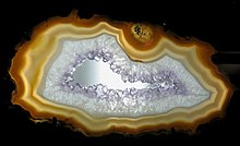 Agate minerals have the tendency to form on or within pre-existing rocks, creating difficulties in accurately determining their time of formation.[7] Their host rocks have been dated to have formed as early as the Archean Eon. Agates are most commonly found as nodules within the cavities of volcanic rocks. These cavities are formed from the gases trapped within the liquid volcanic material forming vesicles.[8] Cavities are then filled in with silica-rich fluids from the volcanic[8] material, layers are deposited on the walls of the cavity slowly working their way inwards.[9] The first layer deposited on the cavity walls is commonly known as the priming layer.[10] Variations in the character of the solution or in the conditions of deposition may cause a corresponding variation in the successive layers. These variations in layers result in bands of chalcedony, often alternating with layers of crystalline quartz forming banded agate.[8] Hollow agates can also form due to the deposition of liquid-rich silica not penetrating deep enough to fill the cavity completely.[11] Agate will form crystals within the reduced cavity, and the apex of each crystal may point towards the center of the cavity.