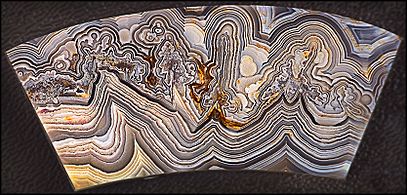 Lace agate is a variety that exhibits a lace-like pattern with forms such as eyes, swirls, bands or zigzags. Blue lace agate is found in Africa and is especially hard.[12] Crazy lace agate, typically found in Mexico, is often brightly colored with a complex pattern, demonstrating randomized distribution of contour lines and circular droplets, scattered throughout the rock. The stone is typically coloured red and white but is also seen to exhibit yellow and grey combinations as well.[13]