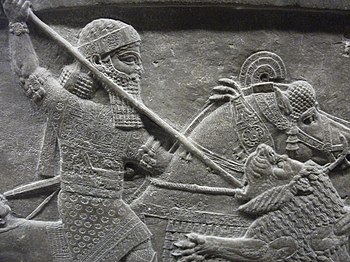 Assyrian relief; King Ashurbanipal spears a lion