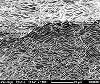 Scanning electron microscope image of aragonite layers in the nacre of a blue mussel (Mytilus edulis)