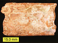 Aragonite forms naturally in almost all mollusk shells, and as the calcareous endoskeleton of warm- and cold-water corals (Scleractinia). Several serpulids have aragonitic tubes.[13] Because the mineral deposition in mollusk shells is strongly biologically controlled,[14] some crystal forms are distinctively different from those of inorganic aragonite.[15] In some mollusks, the entire shell is aragonite;[16] in others, aragonite forms only discrete parts of a bimineralic shell (aragonite plus calcite).[14] The nacreous layer of the aragonite fossil shells of some extinct ammonites forms an iridescent material called ammolite.[17]