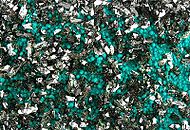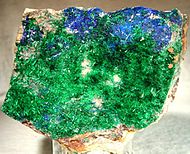 Brochantite on Chrysocolla. Locality: Rokana Mine, Kitwe, Copperbelt Province, Zambia . Detail of larger specimen, field of view about 3 x 5 cm.