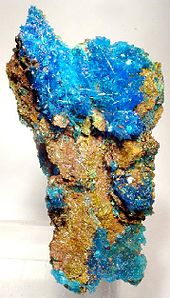 Chalcanthite (from Ancient Greek χάλκανθον (khálkanthon), from χαλκός (khalkós) 'copper', and ἄνθος (ánthos) 'flower, bloom') is a richly colored blue-green water-soluble sulfate mineral CuSO4 · 5H2O. It is commonly found in the late-stage oxidation zones of copper deposits. Due to its ready solubility, chalcanthite is more common in arid regions.
