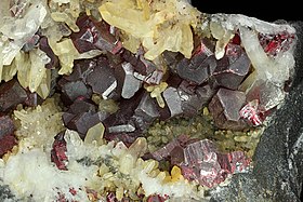 Cinnabar is essentially found in all mineral extraction localities that yield mercury, notably Almadén (Spain). This mine was exploited from Roman times until 1991, being for centuries the most important cinnabar deposit in the world. Good cinnabar crystals have also been found there.[16][17] Cinnabar deposits also appear in Giza (Egypt); Puerto Princesa (Philippines); New Almaden, Hastings Mine, St. John's Mine, Vallejo, California (United States);[18][page needed][better source needed] Idrija (Slovenia); New Idria, California (United States); Moschellandsberg near Obermoschel in the Palatinate; La Ripa, at the foot of the Apuan Alps and in the Mount Amiata (Tuscany, Italy); the mountain Avala (Serbia); Huancavelica (Peru); Murfreesboro, Arkansas (United States); Terlingua, Texas (United States); and the province of Guizhou in China, where fine crystals have been obtained. It was also mined near Red Devil, Alaska (United States) on the middle Kuskokwim River. Red Devil was named after the Red Devil cinnabar mine, a primary source of mercury. It has been found in Dominica near its sulfur springs at the southern end of the island along the west coast.[19]