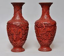 The most popularly known use of cinnabar is in Chinese carved lacquerware, a technique that apparently originated in the Song dynasty.[32] The danger of mercury poisoning may be reduced in ancient lacquerware by entraining the powdered pigment in lacquer,[33][page needed] but could still pose an environmental hazard if the pieces were accidentally destroyed. In the modern jewellery industry, the toxic pigment is replaced by a resin-based polymer that approximates the appearance of pigmented lacquer.[citation needed]