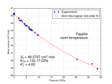 At high pressure, fayalite undergoes a phase transition to ahrensite, the iron-bearing analogue of ringwoodite, i.e., contrary to forsterite there is no intermediate form analogous to wadsleyite; under the conditions prevailing in the upper mantle of the Earth, the transition would occur at ca. 6–7 GPa, i.e., at substantially lower pressure than the phase transitions of forsterite.[5] In high-pressure experiments, the transformation may be delayed, so that it may remain stable to pressures of almost 35 GPa (see fig.), at which point it may become amorphous rather than take on a crystalline structure such as ahrensite.