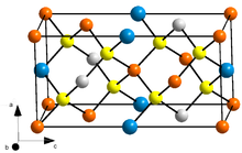 Kësterite is a sulfide mineral with a chemical formula of Cu2(Zn,Fe)SnS4. In its lattice structure, zinc and iron atoms share the same lattice sites. Kesterite is the Zn-rich variety whereas the Zn-poor form is called ferrokesterite or stannite. Owing to their similarity, kesterite is sometimes called isostannite.[5] The synthetic form of kesterite is abbreviated as CZTS (from copper zinc tin sulfide). The name kesterite is sometimes extended to include this synthetic material and also CZTSe, which contains selenium instead of sulfur.[6][7]
